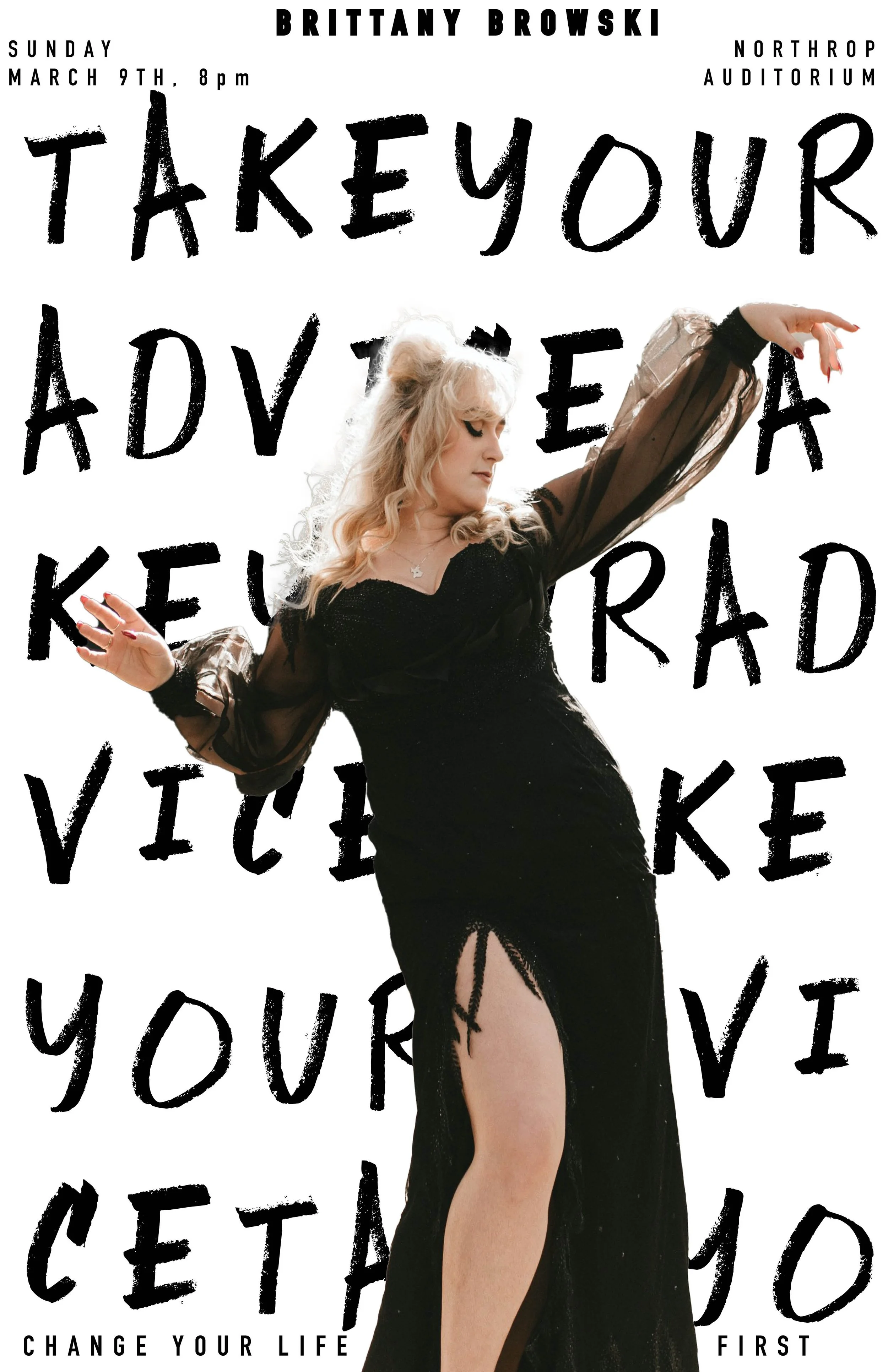 As part of my Media Design class, I designed a campaign for comedian and online personality Brittany Browski for a hypothetical tour called Taking Your Own Advice. Brittany is a podcaster and YouTuber, best known for her hot takes and blend of relatability and glam. During her live podcast, Brittany brings her experience with critique to the stage, sharing her wisdom on how to give and take advice with accountability.